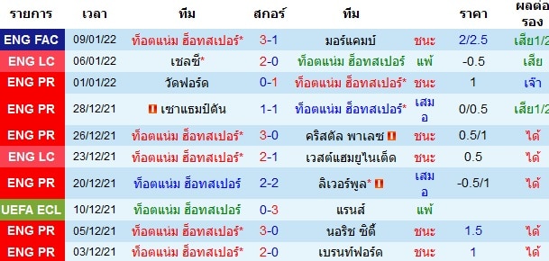 สถิติการพบกัน 10 นัดหลังสุดของทั้งสองทีม