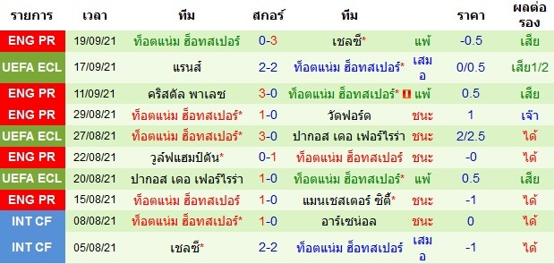 สถิติการพบกัน 10 นัดหลังสุดของทั้งสองทีม