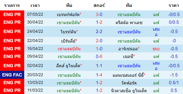 สถิติการลงเล่น 10 นัดหลังสุดของทั้งสองทีม